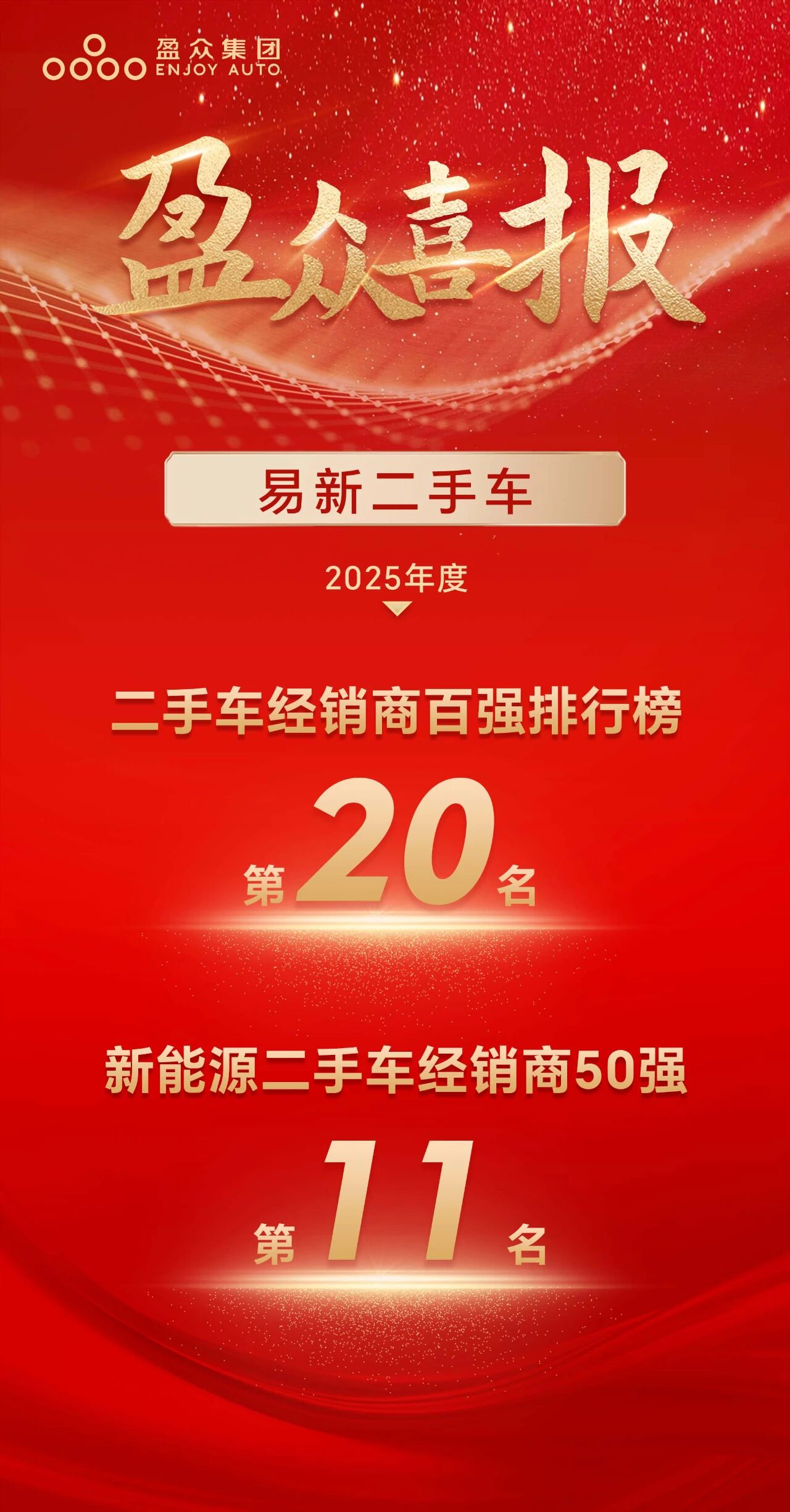 同時,易新二手車還上榜“2025年度中國汽車流通行業(yè)新能源二手車經銷商五十強”,位列全國第11名。