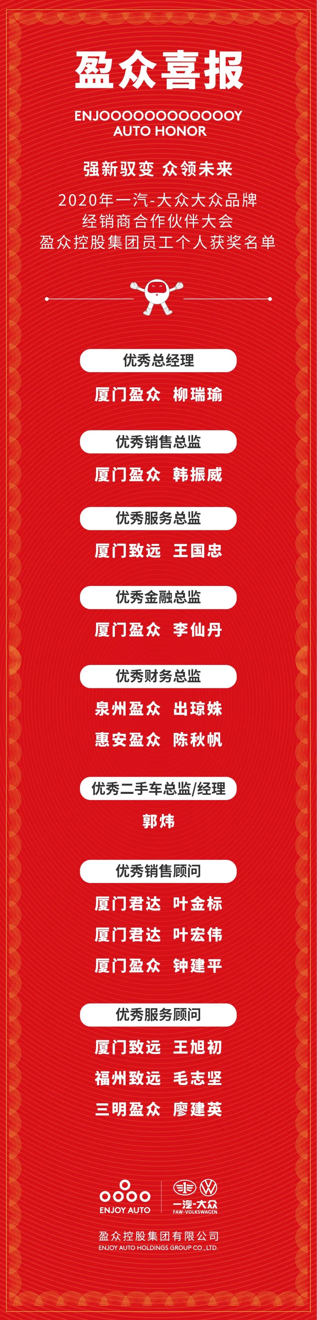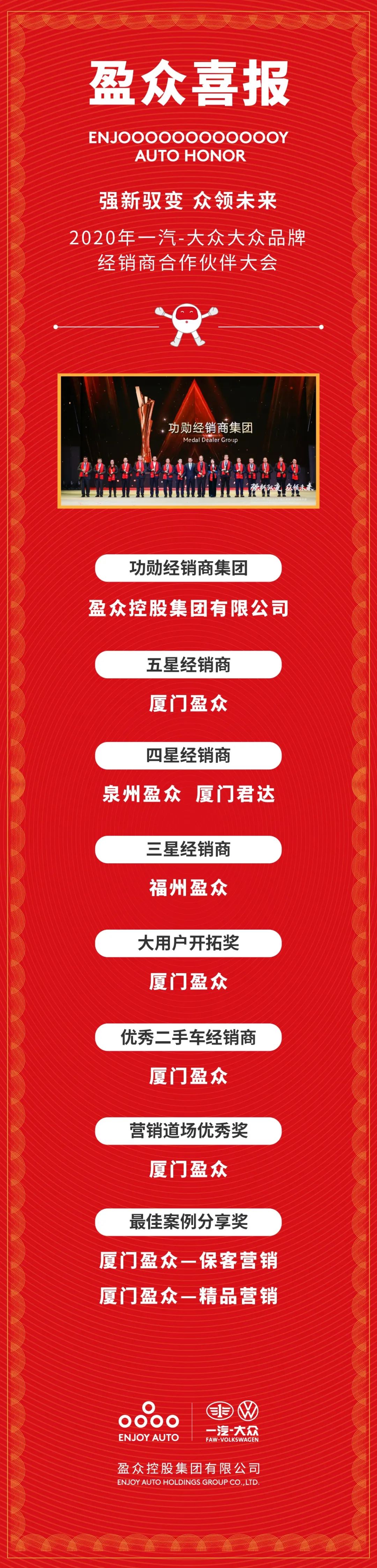 在這場一年一度的一汽-大眾年度盛會上,盈眾控股集團憑借2020年出眾的銷售業(yè)績、高標準的服務水平以及優(yōu)秀的企業(yè)經營能力,再度榮獲功勛經銷商集團、五星經銷商等大獎。其中,廈門盈眾已連續(xù)12年獲得五星經銷商榮譽稱號。泉州盈眾、廈門君達、福州盈眾等多家4S店榮獲星級經銷商等榮譽。