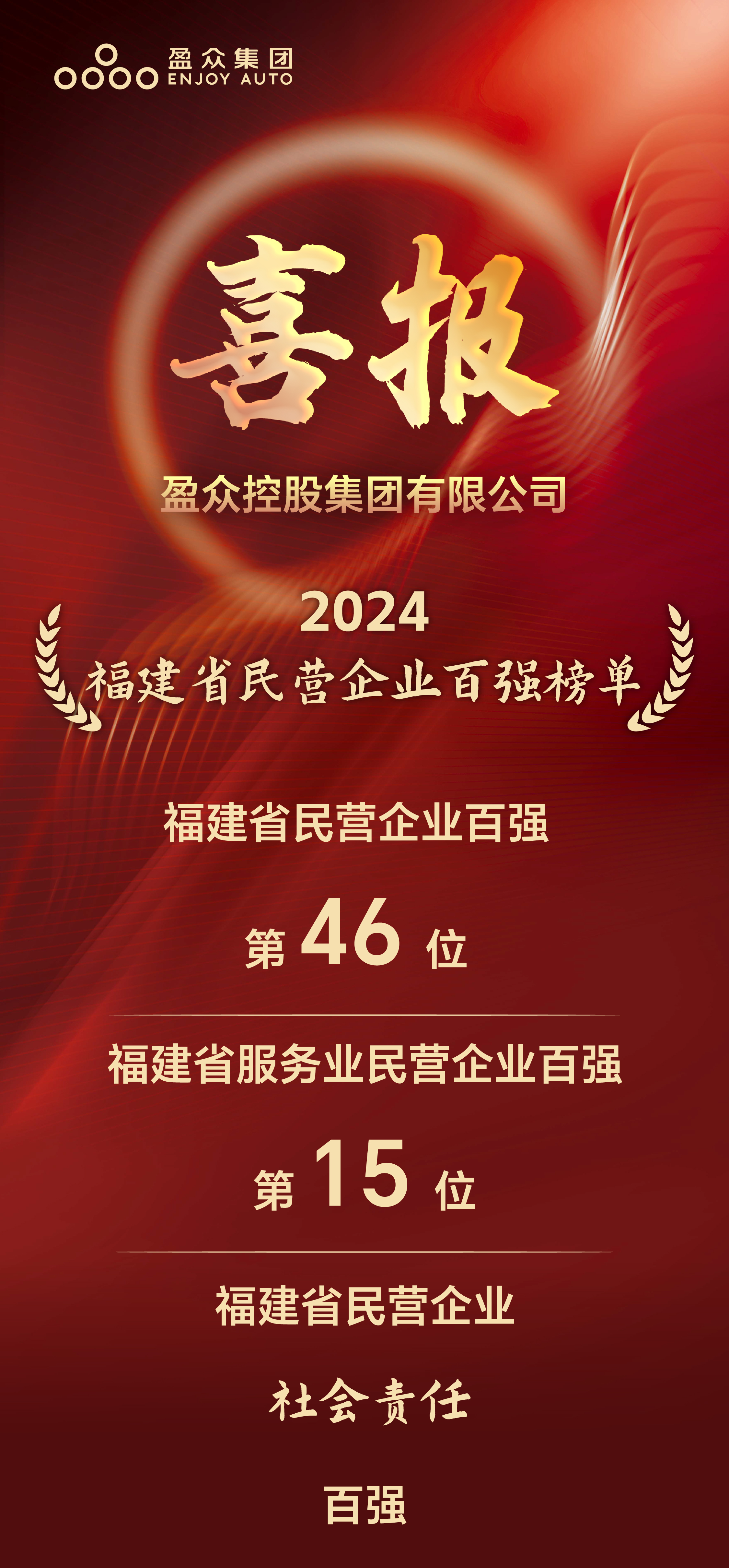 9月19日,福建省工商聯(lián)權威發(fā)布2024年度福建省民營企業(yè)百強榜單,包括2024福建省民營企業(yè)100強、服務業(yè)民營企業(yè)100強和福建省民營企業(yè)社會責任100佳。盈眾集團以優(yōu)異表現(xiàn)榮登榜單,位列福建省民營企業(yè)100強第46位,福建省服務業(yè)民營企業(yè)100強第15位,同時,盈眾控股集團還入圍“福建省民營企業(yè)社會責任100佳”。
